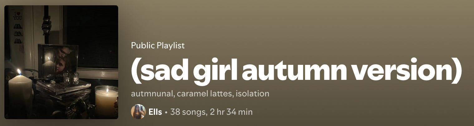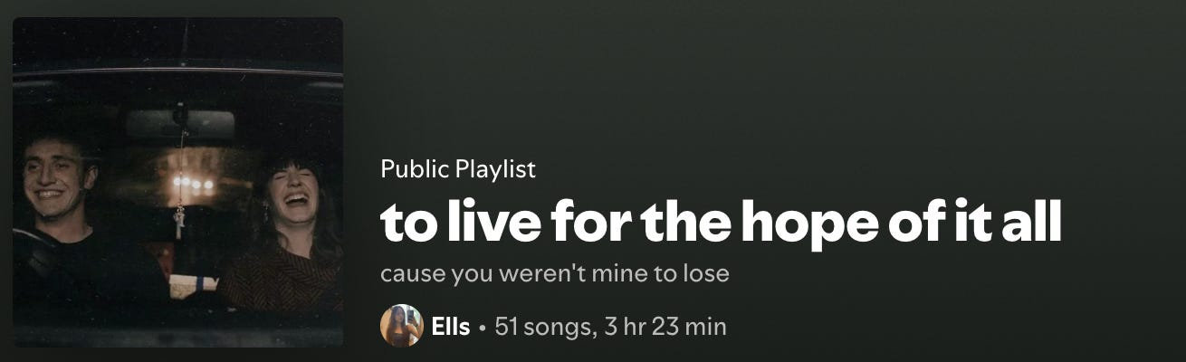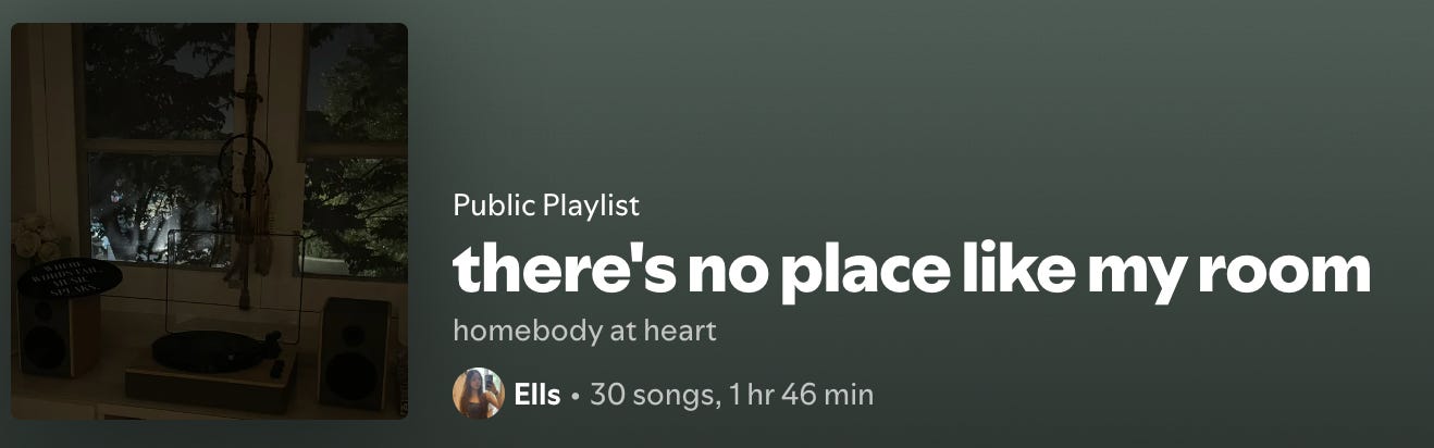 This playlist’s title is taken from the first song because this entire playlist is all about my room. Being alone, simmering in my thoughts, the perfect sad and reflecting songs. I tend to stay home quite often, and really enjoy it because then I get to do everything I love: write, read, post of Substack, watch TV. I Know The End for me personally is a song that just sounds really very much like what my head sounds like. The lyric “No I’m not afraid to disappear” really sticks out to me because every time I do try and get off my phone, I get horrendous FOMO (fear of missing out) and then in addition to that, the vocals at the end of the song are just so loud and sort of carry me through as if I’m looking at my own thoughts in 3rd person. It’s hard to explain, but it’s one of my favorite songs by Phoebe. Big Star is a song that I listen to usually at the end of a tiring day. It’s a kind of reset song, the lyric “But every perfect summer’s gotta say goodnight” really encapsulates that saying that even the season, even if you’ve had a perfect day, it ends and you get to restart. The Gold is a cover by Phoebe and I really just love the instruments. The song sort of reminds me of self depreciation. Although I know it’s not her song, I love her version because the way she sings it is haunting and raw. The song just reminds me of not wanting to be in whatever situation you’re in, a song to listen to when you need to zone out for a while. Right Now is one of my favorite songs in general but for the sake of this playlist, the song is all about wanting to be home. For me personally, my home has always felt like it’s America, even though I live in Thailand. And this song just reminds me more of how much I feel alienated here, and that my room is the only place I truly feel at home in this country. This song also talks heavily about being a homebody, quiet, introverted. Whenever I listen to this song, I’m just reminded of the fact that I feel whole heartedly myself when I’m in my safe little bubble inside my room. Pain Is Cold Water is forever the song about being alone. It puts into words how it feels to be the floater friend, to always be excluded, to want to leave the place you’re in so badly. How people have stigmatized being alone so bad that now every time I’m wanting to do things, I force myself to ask people if they can come along because I’m scared to be by myself.